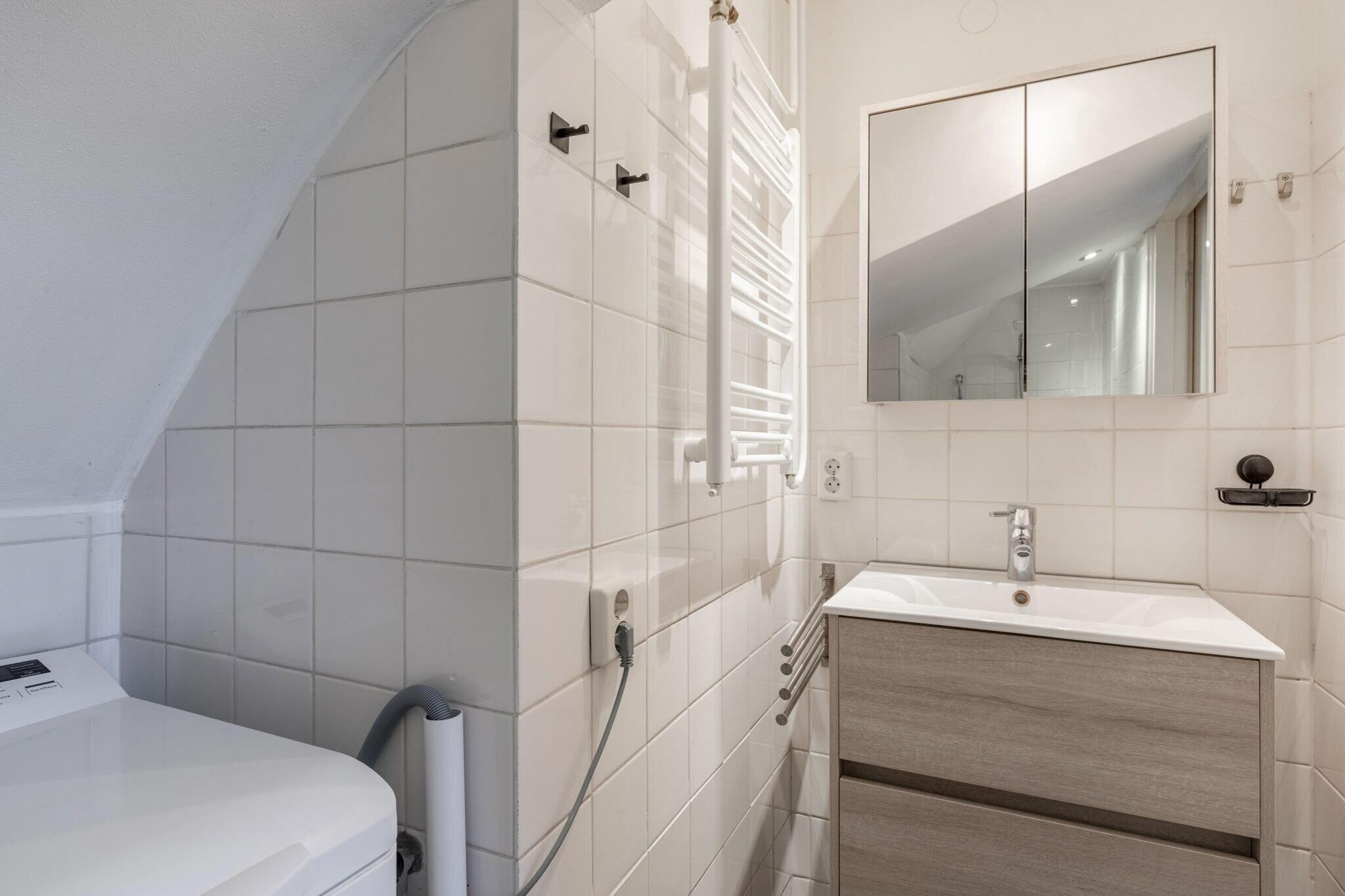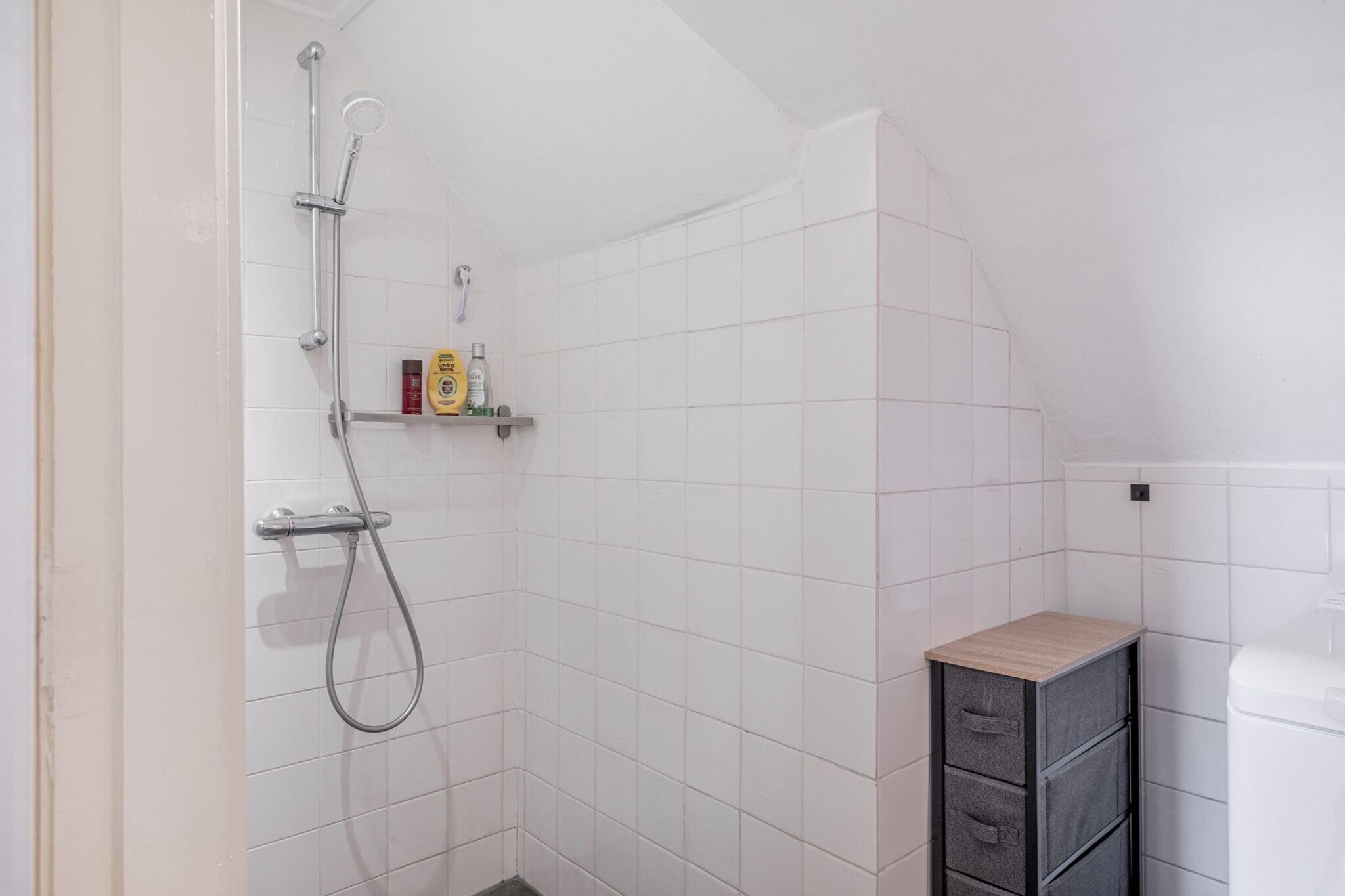 • Badkamer van ca. 3 m² met douche, wastafelmeubel en wasmachineaansluiting.